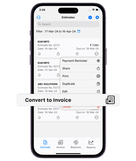 - Convert these Estimates into Tax/Non-Tax Invoices on single click.